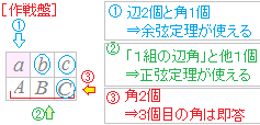 | ※(第二)余弦定理で2次方程式を作る方法は,有力な方法です.この方法を用いるときには,見かけの解が2つ登場する場合がありますので,上の例のように吟味して答を選びます. |