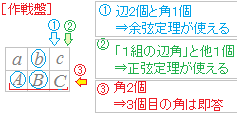 \( 2\sqrt{3}\) \(\sqrt{3}-1 \) \(3+\sqrt{3}\) \(\sqrt{6}-\sqrt{2}\) \(\sqrt{2}+\sqrt{6}\) \(\sqrt{6}\pm\sqrt{2}\) \(3\sqrt{2},\sqrt{6}\) 辺が2つ分かっているから,右の作戦盤@で解く.余弦定理 c2=a2+b2−2ab cos Cに代入 解の公式を使って解くと a>0だから (参考) 右の作戦盤Aにより角Bを求めてから,次にBにより角Aを求め,さらにAにより辺aを求める作戦はAが75°になるので筆算では行き詰ります. 右の作戦盤Aにより角Bを求めると辺角2組がそろうので,次に第1余弦定理により辺aを求めることはできます. ≪この場合の答案の流れ≫ 正弦定理によりB=45°(B=135°はC=60°と矛盾) 第1余弦定理により |