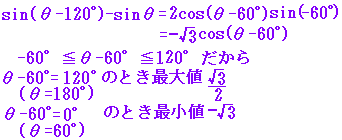 0°<a/2<90°,-90°<θ-a/2<180°だから θ-a/2=90° sin(θ-a)=1/2,sinθ=1/2,θ-a<θだから θ=150°,θ-a=30° よりa=120° |