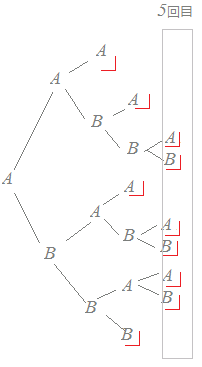 AAAB|BA (Aが4勝になったので終わり) AAAB|BBA (Aが4勝になったので終わり) AAAB|BBB (Bが4勝になったので終わり) |