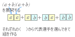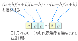 【解説】二項定理通常,式の展開は次のような順序で,「総当たりで」掛けると考えることが多いが,二項定理,多項定理の解説はこの方法では分かりにくいので,「代表選手の選び方」で解説してみる. 右図のように各々の( )からどちらか1つの項 a , b を選んで取り出し,合計 2 個からなる文字の組を考える.○「同じものがあるときの順列」で考える方法 (a+b)n を展開したときの an−rbr の係数を考える. 各々の( )からどちらか1つの項 a , b を選んで取り出し,合計 n 個からなる文字の組を考える. ![]() そこで,abb···ab など n 個の文字のうち,a が n−r 個,b が r 個ある順列を並べ替えてできる順列の総数を数える. 全部異なるものが n 個あるときは,並べ替えてできる順列は n! 個あるが,a は同じものなので,その内部交換でできる (n−r)! 通りは別のものができないから, n! 個とすると (n−r)! 倍だけ数え過ぎで,正しくは 通り. 同様にして,b も同じものなので,その内部交換でできる r! 通りは別のものができないから,上のように 通りとすると r! 倍だけ数え過ぎで,正しくは 通り. 結局,a が n−r 個,b が r 個,それぞれ同じものがある合計 n 個の文字 abb···ab を並べ替えてできる順列の総数は, 通りだから,上のように代表の組を作るとan−rbr は 回登場する. これらの同類項をまとめると,係数は になる. (■→続く■) |