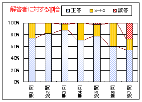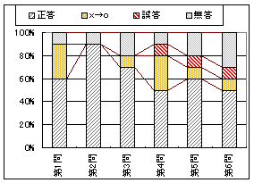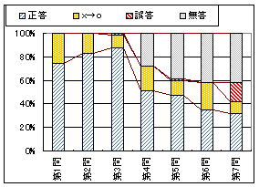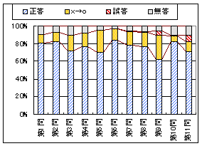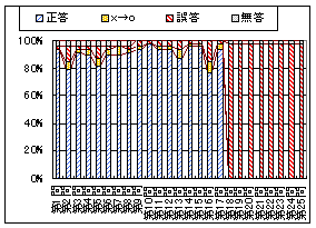 左のグラフ1は問題ごとの正答,誤答,無答の割合(正誤は最初の採点)で,黄色で示したものは初め誤答で再試行の結果正答に変った割合を表わす.