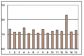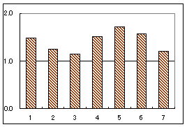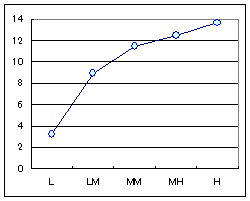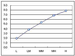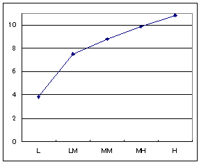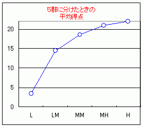 グラフ4は回答者全体をその合計得点によって高(H)〜低(L)の5群に等分したときの群別平均得点のグラフである.これによれば,この頁全体は下位群が精度よく(傾きが大きい)識別でき,診断テストなどに適していることが分かる.