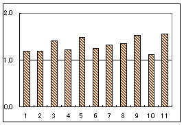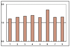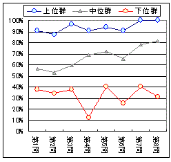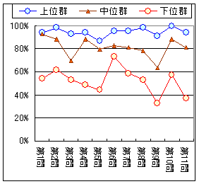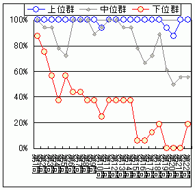 グラフ5は回答者全体をその合計得点によって上位群,中位群,下位群の3群に等分したときの群別・問題別正答率で,どの問題についてもUL指数(上位群と下位群の正答率の差)は0.39〜0.66と大きく,練習用だけでなくテスト用にも使えることが分かる.