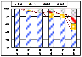 左のグラフ1は問題ごとの正答,誤答,無答の割合(正誤は最初の採点)で,黄色で示したものは初め誤答で再試行の結果正答に変った割合を表わす.