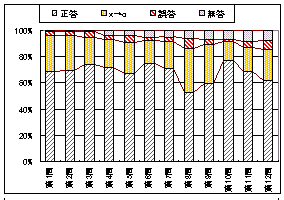 左のグラフ1は問題ごとの正答,誤答,無答の割合(正誤は最初の採点)で,黄色で示したものは初め誤答で再試行の結果正答に変った割合を表わす.