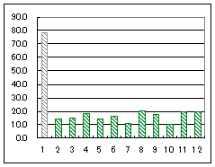 グラフ2は横軸が問題番号,縦軸は直前の操作以降その問題の採点までの経過時間(秒)を表わす.ただし,第1問は初めからの時間.