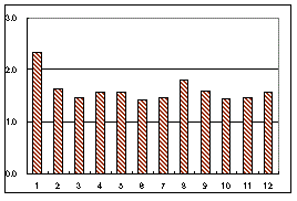 グラフ3は問題ごとの試行回数を表わす.(ただし,同一問題を16回以上試行した答案については16回と見なす.)