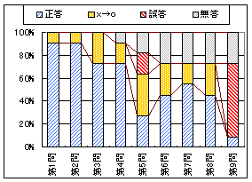 左のグラフ1は問題ごとの正答,誤答,無答の割合(正誤は最初の採点)で,黄色で示したものは初め誤答で再試行の結果正答に変った割合を表わす.