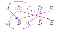 例 次の関係が成り立つとする. A でないならば B も D も成り立つ.このとき,次のような図を描けば,これらの関係が分かる. ![]() ![]() A でないならば C が成り立つ. |