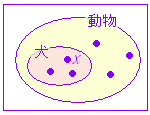 例 「犬ならば動物である」という主張を,「犬→動物」で表わす. このことを集合を用いて表わすと ![]() これは,「集合 A のどんな要素 x を持ってきても,かならず B の要素になる」ということを表わしている. 要素で書けば : x∈A → x∈B 集合で書けば : A⊂B (*) A⊂B という記号は,数の大小を表わす不等号 x<y とよく似た記号であるが,A⊂B という記号は A=B の場合も含めて用いる.(時代によって変遷があるが,最近の高校の教科書では,A⊆B という記号は使われていない.) 例えば, 例 次の関係が成り立つとき,集合 A , , , C は等しい. すなわち,A===C が成り立つ. ![]() |