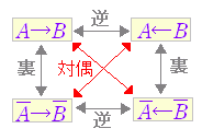 ![]() ○逆 : B → A は必ずしも成り立たない. 例えば,上の図で,c∈B であるが c∈A ではないから,B → A は成り立たない. ○裏 : → は必ずしも成り立たない. 例えば,上の図で,c∈ であるが c∈ ではないから, → は成り立たない. ○対偶 :次の図で分かるように ⊂ だから → が成り立つ. ![]() |