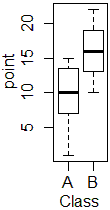 Rコマンダーの箱ひげ図では,極端値(外れ値)は※2 図1のType Cの箱ひげ図を見ると,最大値が第3四分数から離れたところにあることが分かります.また,Type Cは左寄りの分布になっています. ※3 Type Aの箱ひげ図を見ると,最小値が中央値に一致しており,下位グループが濃い,左寄りに分布になっていることがわかります. |
