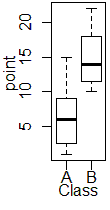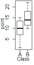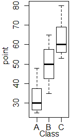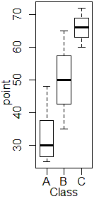 層別(A,B,Cという種類別の)箱ひげ図というものを作成するためには,右の表6の形式でデータを準備します.(並べ方は適当でいいですが,種類別に箱ひげ図を作るには数値の欄以外に種類を表す文字が必要です.)RとRコマンダーのインストール方法は,この頁に解説があります. ≪手順≫ (1) Excelの中からRコマンダーを起動しておきます. (2) Excelで表6の形式でデータを準備し,データの範囲をコピーしてクリップボード(メモリ)に入れます. (3) Rコマンダーのメニューで,データ→データのインポート→テキストファイルまたはクリップボード...から 「ファイル内に変数名あり」にチェック,「クリップボード」,フィールドの区切り記号は「タブ」→OK (4) データが正しくインポートされたかどうか[データセットを表示]のボタンを押す (5) グラフ→箱ひげ図→層別のプロット→OK,OK (6) 右図1の箱ひげ図ができます.