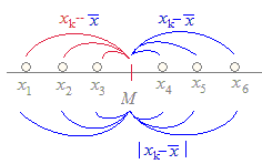 ○ データの各々の値と平均値 との差xk− (k=1,2,3,..)のことを偏差といいます. ▼ 偏差が大きいほど中心付近から離れているので,この偏差の平均値を求めると,全体の散らばり具合が表せるのではないかと考えてみます.ところが,右図2の例では,x4− , x5− , x6− は正の値になりますが,x1− , x2− , x3− は負の値になって,偏差の平均は0になるため,散らばり具合を表すことができません.