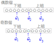奇数個ならば,全体の中央値を除いた上組と下組の各々について=MEDIAN()を求める.