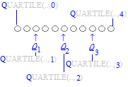 Excelのワークシート関数 =QUARTILE(第1引数, 第2引数) において,第2引数にQ1 , Q2 , Q3の添え字1, 2, 3を指定すると各々の四分位数が返されます.さらに,第2引数に0を指定すると最小値,4を指定すると最大値が返されます. ただし,四分位数には幾つか異なる定義があり,高校の教科書の定義とExcelに使われている定義とでは,第2四分位数は一致しますが,第1四分位数,第3四分位数は必ずしも一致しません.(データの個数が多くなるとこの差異は無視できる程度に微小なものとなります.) 高校の教科書の定義に従った四分位数をExcelを使って求めるには,