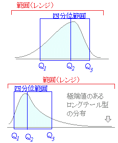 ■四分位範囲第3四分位数と第1四分位数との差 Q3−Q1 を四分位範囲といいます. 前に述べた「範囲(レンジ)」は,最大値から最小値までの幅で定義されますので,極端値(外れ値)があるときにその影響を受けやすくなります. これに対して,「四分位範囲」は多くの場合,右図のように社会現象でよく表れるロングテール型の分布においても,極端値を除いたデータの主要部分のある範囲を表します. |