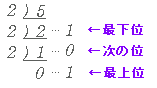 | 参考 ( a×22+b×2+c) 2 + ↑ 2で割った余りd ↑(2で割った商) 以上の方法をまとめると,次の図になります. ![]() |