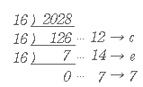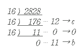 | 16進数に直す計算の例 1つの文字で10,11,12,...,15を表わすには a,b,c,...,f を用いる. ・ ![]() だから 2828 = 11×162 + 0×16 + 12 = b0c(16) ・ ![]() だから, 2028 = 7×162 + 14×16 + 12 = 7ec(16) |