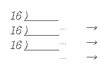 a×163+b×162+c×16+d の形でdを求めるには,16で割った余りを求めるとよい. (2) 次に c を求めるには,上で求めた商a×162+b×16+c を16で割って余りを求めるとよい. (3) 同様にして商が0になるまで余りを並べれば,できあがり. ただし,1つの文字で10,11,12,...,15を表わすには a,b,c,...,f を用いる. 例 10進数の167を16進数に直すには (1) 167÷16=10・・・7 ⇔ 167=10×16 + 7 (2) 10をaで表わして a×16+7= a7(3) |