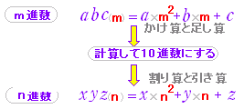 | 次の図のように,一度10進数に直せばm進数をn進数に直すことができます. 例 5進数の 123(5) を7進数に直すには, 123(5) = 1×52 + 2×5 + 3 = 38(10) = 5×7 + 3 = 53(7) |