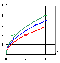 図において緑で示したものはy=のグラフで,●で示した点は,x=3 , y=3を表す.