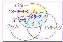 | (2) 50 人の学生が食堂でトーストを食べたとき,トーストに何をつけたか尋ねたところ,バターをつけた学生は 18 人,ハチミツをつけた学生は 27 人,ジャムをつけた学生は 25 人,バターもハチミツもつけた学生は 6 人,ハチミツもジャムもつけた学生は 12 人,ジャムもバターもつけた学生は 7 人,3種類ともつけた学生は 2 人であった. バターだけをつけた学生は何人か. |