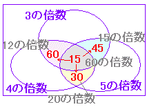 ※ 3 桁の正の整数とは 100 から 999 までの整数をいう. ※ 1から始まっているのではなく,100以上で各々最初に当てはまる数がずれているので,割り算だけでは倍数の個数は求まらない.そこで,1〜999の範囲で該当するものから1〜99までの範囲で該当するものを引けば100〜999までの範囲で該当するものが求まる. ○ ベン図を描いて次のように数字を埋めていくとよい. ![]() (75+45+60 - 15 ではないので注意.60 の倍数を2回数えてはいけない.) |