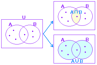 A と B の共通部分を A∩B で表わす. A と B の少なくとも一方に含まれるものの集合を A , B の和集合といい, A∪B で表わす. (コップを∪向きに置くと水はたくさん入り,∩向きに置くと少ししか入らない.この記号は,視覚的に分かりやすい.) ![]() |