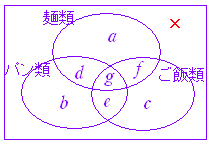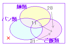 | (1) 65 人の学生に,昨日の食事について,麺類・パン類・ご飯類のどれを食べたか調査したところ,麺類を食べた学生は 28 人,パン類を食べた学生は 31 人,麺類もパン類も食べた学生は 11 人で,3種類のどれも食べなかった学生はいなかった. ご飯類だけを食べた学生は何人か. |