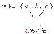 (簡単な例)nPr=n(n - 1)(n - 2) ··· (n−r+1) …(1) nPr= …(2) ※ 実際の計算は(1)でやればよい. 3個のもの { a , b , c } から2個取って並べると, ba , bc , ca , cb , これを,3個から2個取って並べる順列の総数として 3P2 で表わす. [考え方]右図のように3つの候補者から選んで,左右2つの箱に並べるとき, 左の箱の入れ方は { a , b , c }のどれでもよいから3通り その各々について,(同じものは右の箱に使えないから)右の箱の入れ方は(残りの)2通り. 積の法則によって 2×3=6通り 3P2=6 になる. 例題1 次の値を求めよ. (1) 4P2=4·3=12(2) 3P3=3·2·1=6 例題2 5 個の数字 1 , 2 , 3 , 4 , 5 から2つ使ってできる2桁の整数は何個あるか.ただし,同じ数字は使わないものとする. 5×4=20 個 ※(参考) 教科書には余計なことはほとんど書かれていないが,理屈の上では余計なことでも,生徒が実際に行き詰まる箇所で,言われればストーンと納得することもある. ⇒ 上の解説では,左の箱から先に入れているが,実は右の箱から入れてもよい. その場合,右の箱の入れ方が3通り,その各々について左の箱の入れ方が2通りになるから,2×3=6通り ⇒ このように「どこから入れてもよい」ということから,「条件の難しい所を先に入れる」と便利だということが分かる. 例題3 5 個の数字 1 , 2 , 3 , 4 , 5 から3つ使ってできる3桁の奇数は何個あるか.ただし,同じ数字は使わないものとする. 右図のように,1の位,百の位,十の位の順に入れると 奇数になるには1の位の数は 1 , 3, 5 のどれかで3通り その各々について,百の位の入れ方は(残りの)4通り その各々について,十の位の入れ方は(残りの)3通り 結局,3×4×3=36個 (n個からr個取って来るとき) 右図のようにn個の候補者から1つ取ってきて,左から1番目の箱に入れる方法は