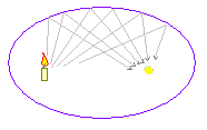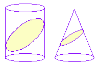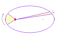 | ■4 自然界にある楕円 ○ [図6] 円柱や円錐を斜めに切ると楕円ができる.真横に切ったときは円になる.(円錐は,切り方によっては,「楕円」「放物線」「双曲線」になる.) ○ [図7](ケプラーの第1法則) 太陽系の惑星は,太陽を1つの焦点とする楕円軌道を描いている.(地球の場合, a : b の値は,実際にはもっと1に近い) もう一つの焦点には,何もない. ○ [図8] 【面積速度一定の法則】(ケプラーの第2法則) 惑星が太陽のまわりを回るとき,太陽に近いところでは速く回り,太陽から遠いところではゆっくり回るので,一定時間(例えば1日とか1時間)に描く扇形(右図黄色の図形)の面積はつねに一定になる. ○ [図9] 楕円の1つの焦点から出た光が楕円の周上で反射されたとき,もう一つの焦点に集まる.したがって,1つの焦点にろうそくなどの光源があれば,他方の焦点に置かれた物体は「焦げる」・・・焦げる点:焦点 (ただし,これは平面における楕円を長軸のまわりに回転した楕円体についての話である.) |