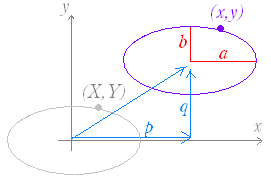 ![]() x 軸の正の向きに p,y 軸の正の向きに q だけ平行移動しているときに, +=1 になるので,見かけの符号と逆になる点に注意. +=1 ならば,x 軸の負の向きに p,y 軸の負の向きに q だけ平行移動したものとなる. これは,x=X+p , y=Y+q ←→ X=x−p , Y=y−q の関係による. +=1 のように移動前後の座標を重ねてみると,移動前の座標 X , Y についての関係式が浮かび上がる.このとき,移動前の座標は X=x−p , Y=y−q のように引き算で表わされている. |