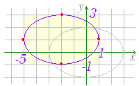 (→続き) a=2 , b=1 → 2a=4 , 2b=2 p=2 , q=−1 元の焦点は ( , 0) , (− , 0) だから,これを x 方向に 2 , y 方向に −1 だけ平行移動して,(2+ ,−1) , ( 2− ,−1) 概形は ![]() |