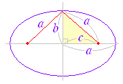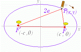 基本が分かったら,図4-2のように2焦点を結ぶ線分の長さを足して三角形にすると,糸が巻き付かずに鉛筆を滑らかに1周することができる.なぜこれでできるのか,やってみたら分かる. F(c , 0) , F’(−c , 0)から距離の和が 2a である点 P(x , y) の軌跡の方程式は,次のように求めることができる. FP+F’P=2a ←→ +=2a ←→ =2a− 両辺を2乗する → (x−c)2+y2=4a2−4a+(x+c)2+y2 ←→ - 4cx=4a2−4a ←→ a=a2+cx 両辺を2乗する → a2{ (x+c)2+y2}=a4+2a2cx+c2x2 ←→ a2x2+2a2cx+a2c2+a2y2=a4+2a2cx+c2x2 ←→ a2x2+a2c2+a2y2=a4+c2x2 ←→ (a2−c2)x2+a2y2=a4−a2c2 ←→ +=1 ここで,右図のように直角三角形を描くと,糸の長さが 2a だから,直角三角形の斜辺は a. そこで,b2=a2−c2 とおくと,三平方の定理(ピタゴラスの定理)により,b は右図の長さになる. |