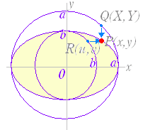 | ■3 円から楕円を作るには 右図において a>b>0 とする. ア) 外側の大きな円 X2+Y2=a2 を縦(y)方向に 倍に縮小すると楕円になる. X2+Y2=a2 , y=Y , x=X → x2+(y)2=a2 → +=1 イ) 内側の小さな円 u2+v2=b2 を横(x)方向に 倍に拡大すると楕円になる. u2+v2=b2 , x=u , y=v → (x)2+y2=b2 → +=1 |
