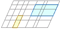 | (2) 次の図のように6本の平行線と8本の平行線が交わっているとき,この図の中に平行四辺形は何個できるか.(例:図中黄色及び青で示したような図形も各々1個の平行四辺形と数える.)
