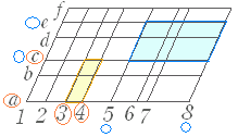 例えば,上の図において黄色の平行四辺形は,横線 a〜 f から2本(a と c )を選び,斜め線 1〜 8 から2本(3 と 4 )を選んだ場合の図形となっている.青の平行四辺形は各々c と e, 5 と 8 を選んだ場合の図形. そこで,総数を求めると 横線の選び方は 6C2==15 通り 斜め線の選び方は 8C2==28 通り 平行四辺形の総数は 15×28=420 |