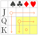 【積の法則】 ○1列に並べる方法 n を調べると,1枚目はどれでもよいから12通り. その各々について,2枚目は種類も数字も異なるカードから取るから,取り方は6通り. その各々について,3枚目は前2枚と種類も数字も異なるカードから取るから,取り方は2通り. n=12×6×2=144 ○異なる3枚のカードの並べ方 n は,選び方 m の3! 倍あるから,m=n÷3!=24 |