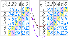【重複組合せ,場合の数】 ○14個のボールを x , y , z , w≧1 となるように分けるには,初めに1個ずつ渡しておき,残り10個を分ければよい. 4人に重複を許して10個のボールを分ける方法を求めると,4H10=13C10=286 ○上記の解には x=11 , y=1 , z=1 , w=1 のように x , y , z , w>6 となるものも含まれているので,さいころの場合にそのまま適用することはできない. 同様にして, x+y=2 , z+w=12 → 1×1=1通り x+y=3 , z+w=11 → 2×2=4通り x+y=4 , z+w=10 → 3×3=9通り ・・・ x+y=7 , z+w=7 → 6×6=36通り ・・・ x+y=12 , z+w=2 → 1×1=1通り 全部で 1+4+9+16+25+36+25+16+9+4+1=146 通り |