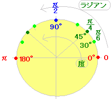 例![]() よく使うのは,30°,45°,90°,180°の整数倍 135°=3π/4 -120°=-2π/3 360°=2π など |