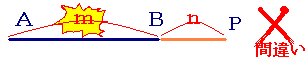 線分ABの外側は,Aの外側とBの外側の2か所に分かれます.![]() ![]() ※この間違いはビックリするほど多いので,気を付けよう! Aの外側に点Pを置くと,BPはAPよりも大きくなります.Bの外側に点Pを置くと,APはBPよりも大きくなります. ![]() また,線分ABを「3:2に外分する」点Pのように, m>nとなるとき,外分点PはBの外側にあります.