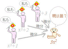 ○ ある関数を「親」に例え、その導関数(微分)を「子供」に例えるとき、「親が決まれば子供は決まる」が「子供を決めても親は決まらない」。 例えば、微分して3x2になる元の関数はx3だけとは限らず、x3+1 , x3+2 , x3+3 , …のように定数項だけ異なる関数もすべて微分すると3x2になる。 ![]() * F(x)の微分がf(x)になるときF(x)をf(x)の原始関数という。微分を指定しても原始関数はただ1通りには決まらず、定数項の分だけ不定になる。そこで、定数項Cの部分を不定にしたままで原始関数の集まりをF(x)+Cと表したものを不定積分という。 ○ 微分することを表す記号: は、分母と分子を含めた全体で1つの記号となっており、一部分だけ約分したりすることはできない。 ○ よく似た約束が積分記号にもあり、積分記号は f(x)dx のように前後をサンドイッチのようにはさんだ形で使い、片方だけではダメ。 読むときは「インテグラル・エフエックス・ディーエックス」などと読む。 ○ の記号はアルファベットのSを縦長に引き延ばしたもの。 ○ f(x)dxにおいてf(x)のことを被積分関数という。 (積分される関数という意味) |