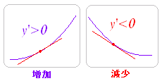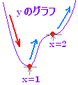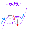 ■解説 <元になる考え方>y ' は接線の傾きを表わすので,y’ の符号の変化を見れば,増加・減少が分かる. y’>0 のところでは,グラフは増加となる. y’<0 のところでは,グラフは減少となる. ![]() |