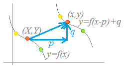 このように新しい関係式は、新座標からx軸の負の向きにpy軸の負の向きにqだけ戻った点が、元のグラフ上にあるということを表している。