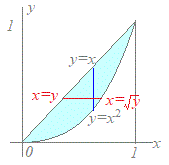 右図(青線)のように,各々の 求めた被積分関数を wxMaximaでの入力 integrate(integrate(2*x*y,y,x^2,x), x, 0, 1); 結果 右図(赤線)のように, 各々の 求めた被積分関数を wxMaximaでの入力 integrate(integrate(2*x*y,x,y,sqrt(y)), y, 0, 1); 結果 |