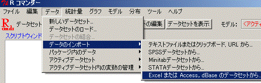 Excel2002のとき (*1) RExcel→Start R (*2) RExcel→RComannder→with separate menus Excel2007のとき (*1)(*2)ともアドインからスタートする. |