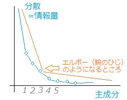 2. カイザー基準とは,元のデータを標準化したデータ(相関行列から分析したとき)を用いたときに利用できる基準.この場合には,全体の分散が「変数の個数」に等しくなり,各変数の分散が「固有値の大きさ」に等しくなることを利用する.主成分に情報を集約しているのだから元の変数1個分以上となる主成分を採用するというのがカイザー基準. 3. 各主成分(component)の分散(variance)を棒グラフにすると図3のようになる.(折れ線グラフで表すことが多い.)このとき次の図のようにエルボーができた所よりも先には情報が少ないので,エルボーまでの主成分を採用するという考え方.