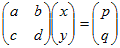 連立方程式 cx+dy=q は,行列を使って と書けるので,Aに逆行列A−1が存在する限り により直ちに解けます.